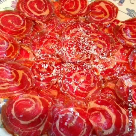 Aliñamos el carpaccio con unos pétalos de sal, un poco de pimienta recien molida, unas gotas de limón mezcladas con unas gotas de vinagre de modena, y con un buen chorro de aceite de oliva virgen extra.