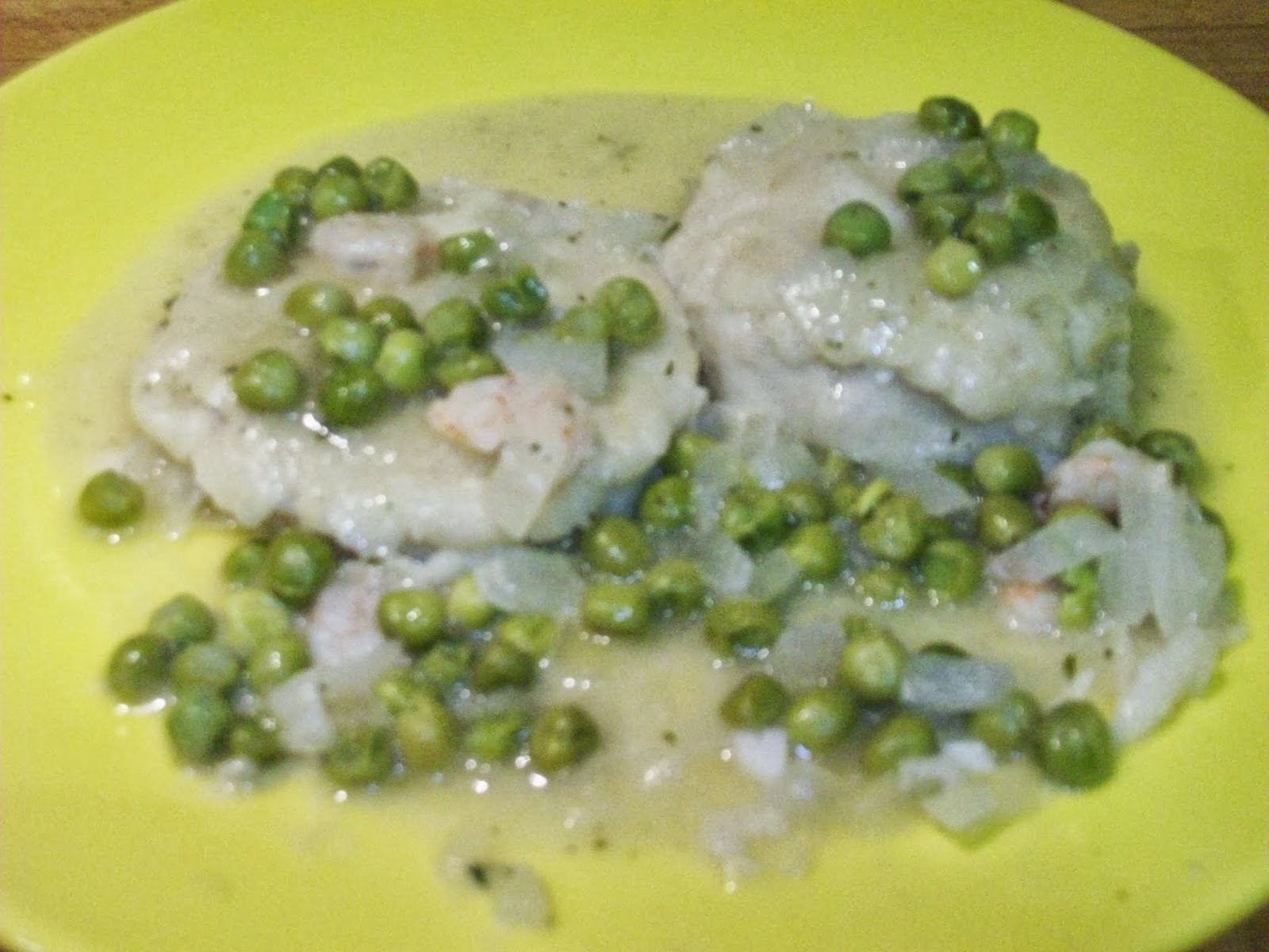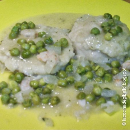 Después echamos guisantes, gambas y cubrimos todo con vino blanco, dejamos reducir a la mitad el vino blanco.