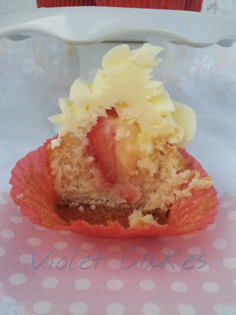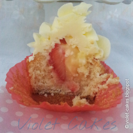 Rellenar los cupcakes con un poquito de lemon curd, incrustar una mitad de fresa en cada uno.