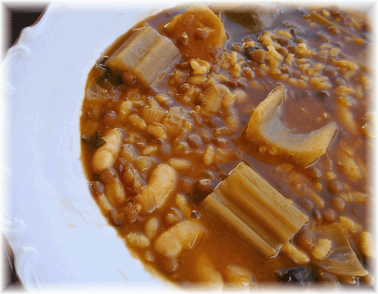 En una olla ponemos a cocer las habichuelas que han estado a remojo desde la noche anterior. Cuando estén casi hechas, pero no del todo para que no se deshagan, añadimos las lentejas, el nabo entero y pelado, las patatas a cuartos, la calabaza picada fina y las pencas. Rectificamos el caldo para que quede todo cubierto y seguimos con la cocción a fuego lento, con la tapa medio puesta.