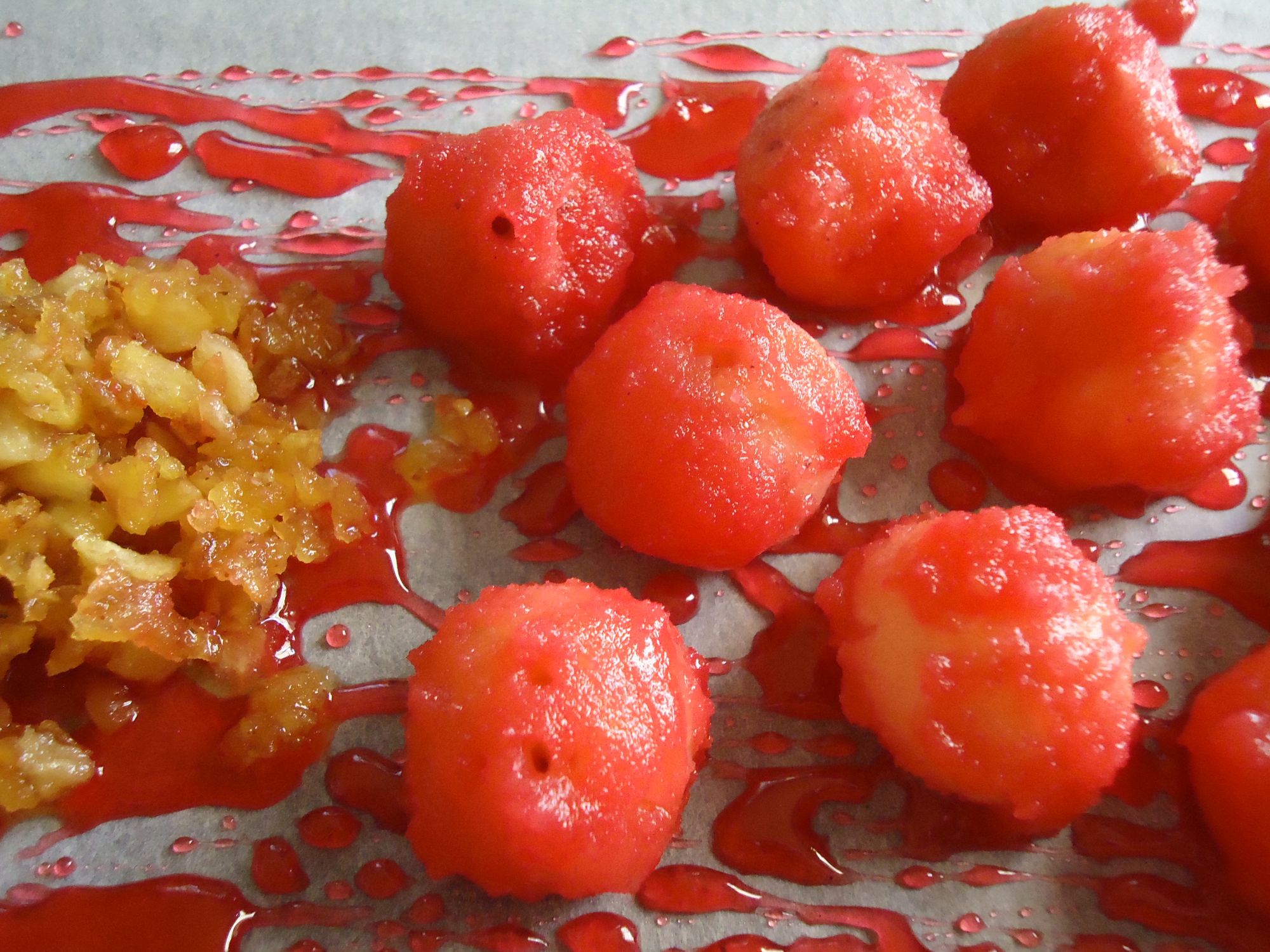 Antes de que el caramelo se empiece a enfriar meteremos las bolitas y las sacaremos una vez que veamos que están bien caramelizadas, dejamos que enfríen y lo acompañamos con el salteado de la manzana.