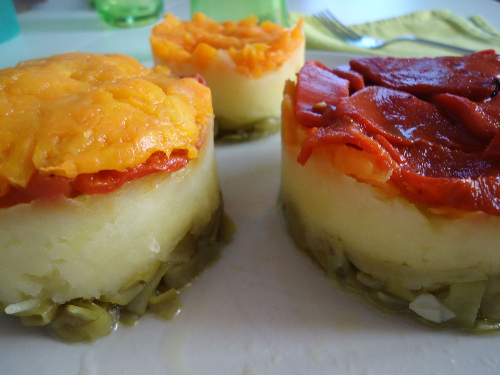 Dentro de un molde circular pondremos una capa de judías verdes, una de puré de patatas, otra de pimientos del piquillo y otra de zanahorias.