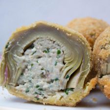 Freir los ajos en otra cazuela junto con las gambas. Flamear las gambas con el brandi. Rellenar con ellas las alcachofas.