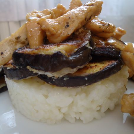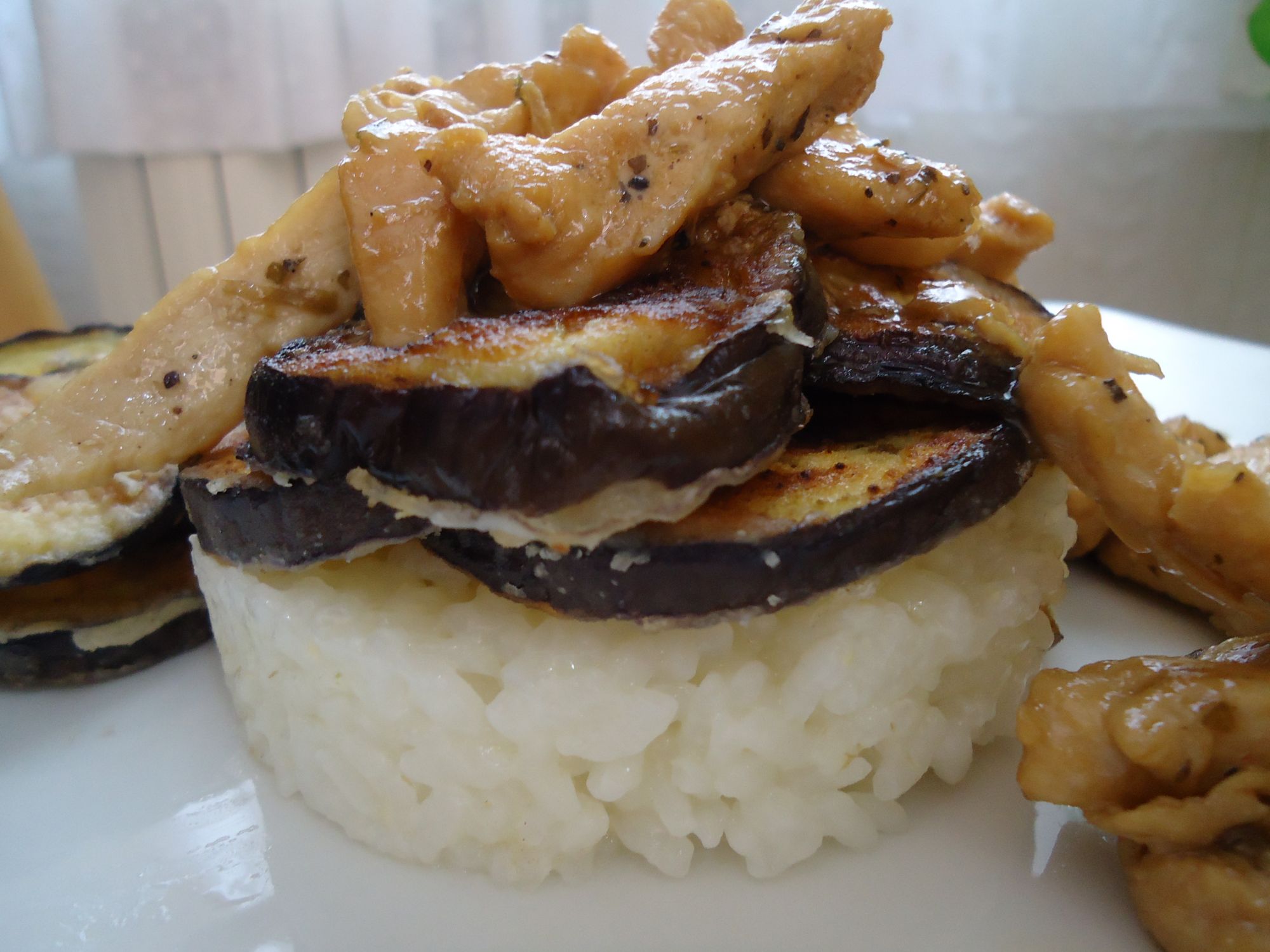 Ahora viene lo más bonito de esta receta a la hora de presentar en la mesa. Primero ponemos una capa bien tupida de berenjenas, luego un poco de arroz en el centro, encima el pollo y por último cubrimos con todo el arroz, iremos apretando con la espátula poco a poco con el fin que queden todos los productos juntitos ya que tenemos que darle la vuelta como si se tratara de una tortilla.