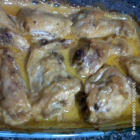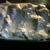 Pon en una fuente el pollo troceado y cubrir con la mezcla anterior.