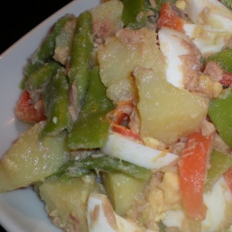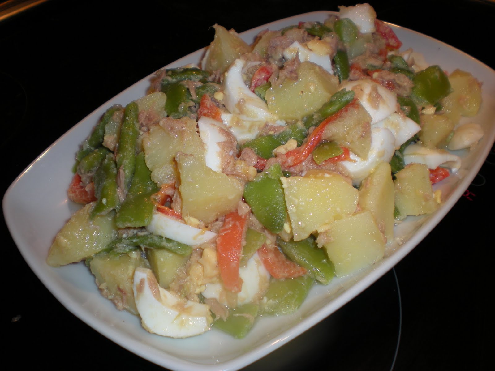 En una fuente ponemos las patatas, las zanahorias, las judías, el atún en conserva escurrido, un chorrito de aceite de oliva y otro chorrito de limón. Mezclamos todo bien y decoramos con los huevos cocidos cortados a rodajas.