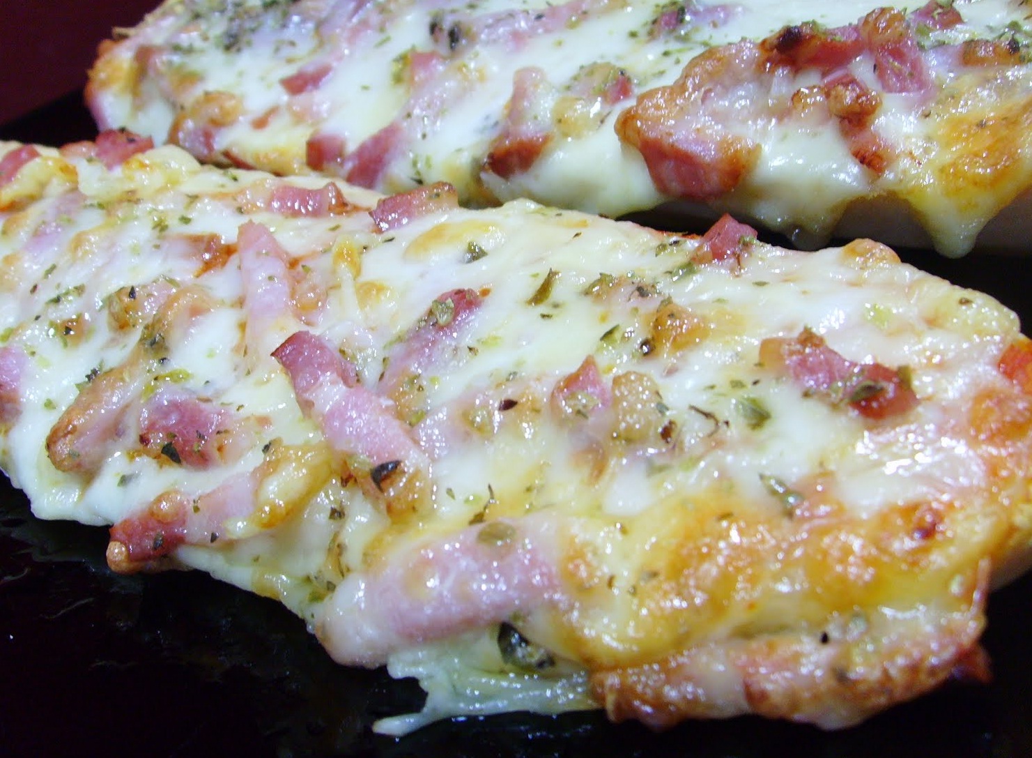Ponemos a precalentar el horno a 230°. Y por ultimo, forrar la bandeja del horno con papel vegetal o lamina de silicona. Cortar los panes por la mitad (a lo largo) y vamos echando con una cuchara la mezcla por encima y los ponemos encima de la bandeja espolvoreamos todas las mitades con la mozzarela y encima el resto de jamón y bacon. Meter al horno unos 15 minutos. Que queden un poco doraditos.