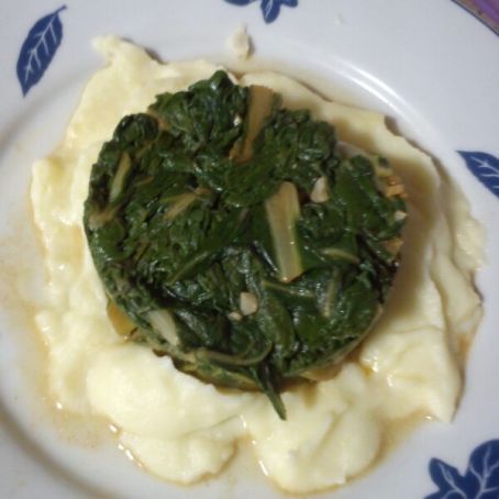 Sirve el puré de patata en un plato hondo, añade las acelgas en el centro con la salsita que ha quedado en la sartén y esparce la cecina frita por encima