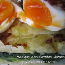 Pica los dientes de ajo y dóralos en una sartén con un chorrito de aceite. Cuando empiecen a coger color, aparta la sartén del fuego, deja que temple y espolvorea con el pimentón. Agrega las acelgas y saltea y deja que se cocine todo durante dos minutos.