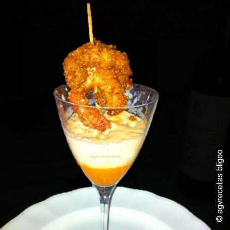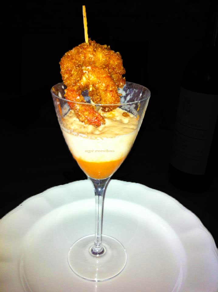 Langostinos crujientes con espuma de gambas al ajillo y crema de piquillos