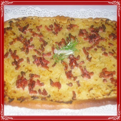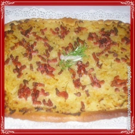 En una bandeja de horno ponemos papel de hornear y extendemos la masa, ponemos encima la cebolla, el bacón y el huevo batido por todo el relleno, ponemos un poco de pimienta molida y horneamos a 200° unos 25 minutos o hasta que esté dorada.