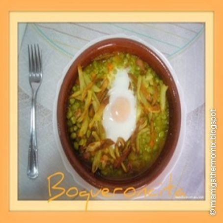 Cuando esten cocidos, poner los guisantes en una fuente de barro, poner por encima las patatas fritas en palillos y los huevos abiertos. Poner al horno a gratinar hasta que los huevos estean cuajados.