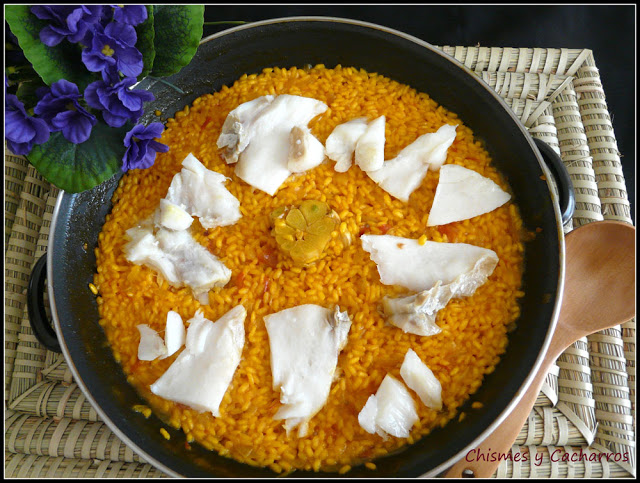 En una cazuela echamos aceite de oliva, cortamos la cebolla muy fina y la rehogamos en el aceite. Añadir la cabeza de ajos cortada por la mitad, cuando este bien pochada la cebolla, sacamos los ajos y reservamos. Ahora pelamos el tomate y lo cortamos en trozos pequeños, añadimos a la cebolla. Cuando ya lo tengamos pochado, añadimos el arroz, el azafrán y la sal. Añadir el agua de cocción del bacalao, el doble que de arroz.