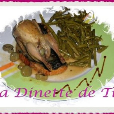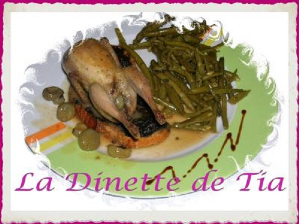Retire las tostas y ponga sobre cada una de ellas una codorniz. Vuelva a introducirlas en el horno durante unos minutos. Mientras tanto diluya en la salsa una pastilla de caldo para espesar ligeramente y sirva inmediatamente las codornices sobre el pan tostado cubierto con salsa y rodeado de higos.