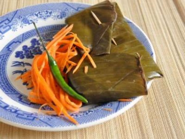 Cortar las hojas de plátano en cuadrados de unos 30 cm de lado. Colóquelas en agua caliente, lo que las suavizará un poco y hará que sean más fáciles de doblar. Séquelas bien luego.