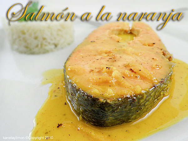 Sazonamos el salmón con la sal, la pimienta y un poquito de ajo en polvo. Rallamos la piel de la naranja en finas tiras y la exprimimos reservando el zumo.