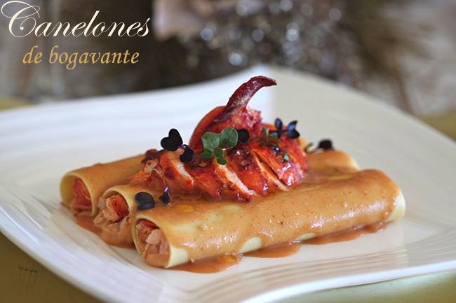Estendemos la pasta de los canelones en una superficie plana, los rellenamos con la velouté, los cerramos y los vamos colocando en una bandeja de horno ligeramente engrasadametemos al horno 3 o 4 minutos, los retiramos del horno, los salseamos con la salsa que tenemos reservada bien caliente y decoramos con los bogavantes.