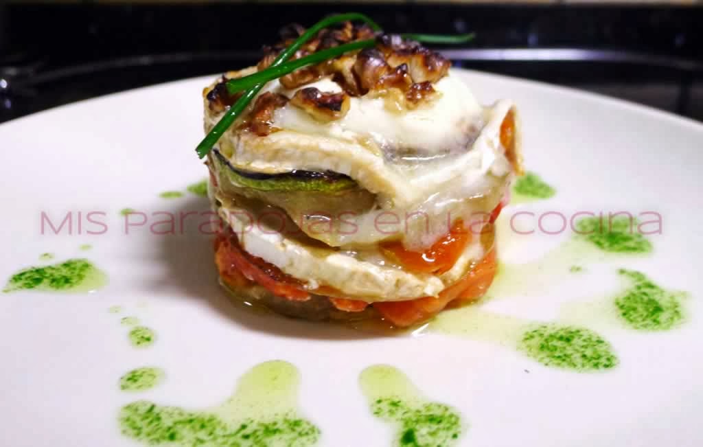 Marcamos todas las verduras con un poco de aceite y su punto de sal. A continuación, montamos en un aro haciendo capas con las verduras y el queso, finalizando con una de queso de cabra y las nueces. Gratinar unos minutos, decorar con cebollino y aceite de ajo y perejil. Servir inmediatamente.