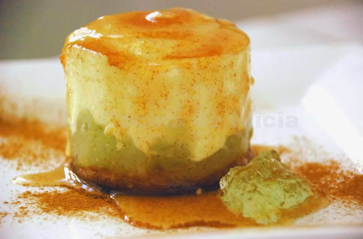Lo siguiente es hacer una gelatina de manzana verde con un cuarto de licor de manzana (yo utilicé sin alcohol) en unos 4 gramos de cola de pescado, previamente hidratada y fundida unos segundos al microondas; mezclar bien, disponer en una fuente adecuada y dejar enfriar antes de colocar los moldes que hemos hecho antes y enfriar rápidamente en el congelador. Una vez tenga su textura, ayudándonos con una espátula y con mucho cuidado pues se rompen con facilidad, trasladamos los discos de la gelatina de manzana verde sobre las bases (que tendremos ya en una bandeja o un recipiente apropiado con papel film o de horno) y les ponemos su molde de acetato.