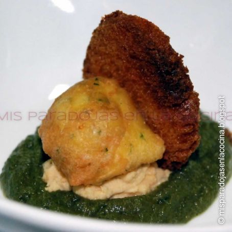 Buñuelos de bacalao con guarnición de espinacas y garbanzos más propina de tostas