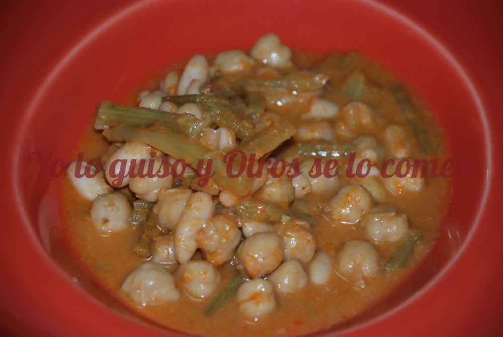 Se limpian bien y se cortan los cardillos, las tagarninas y apio. En una olla echamos garbanzos y alubias en la misma cantidad, la verdura que hemos limpiado, 4 cebollas, 4 tomates, 4 cabezas de ajo, 1 pimiento, comino y pimentón. Cocer en la olla rápida.