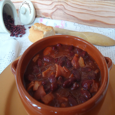 En la misma sartén salteamos un poco la oreja de cerdo (yo he cortado alguno de los trozos mas pequeños) y luego le añadimos el sofrito y mezclamos. Todo esto lo añadimos a la olla con las judías, removemos, tapamos y dejamos que siga cociendo hasta que las judías estén tiernas.