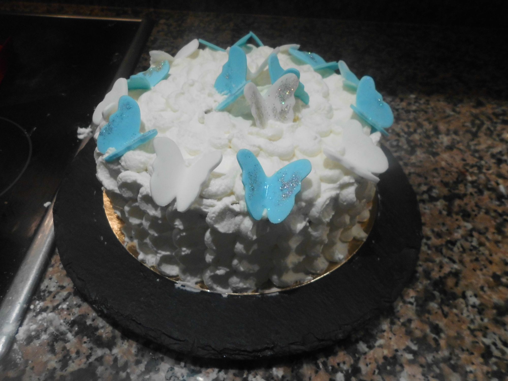 Poner la capa final de bizcocho y forrar toda la tarta con nata.