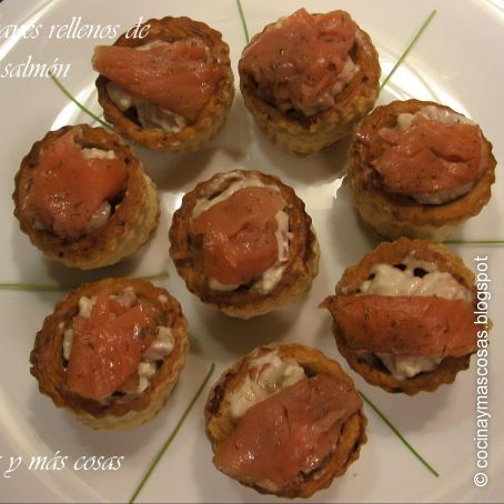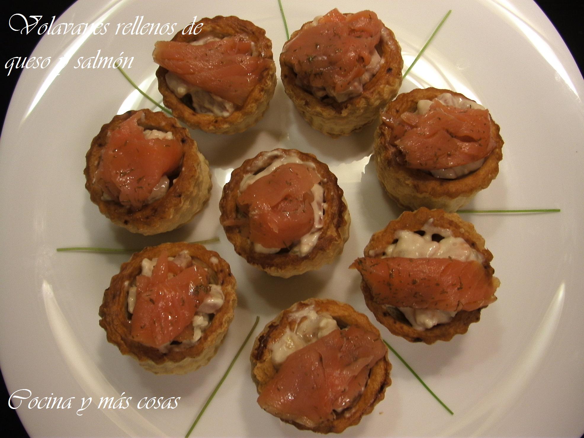 Con una cucharada o cucharilla se rellenan los volavanes y se colocan sobre ellos un rollito de salmón que habremos cortado previamente.