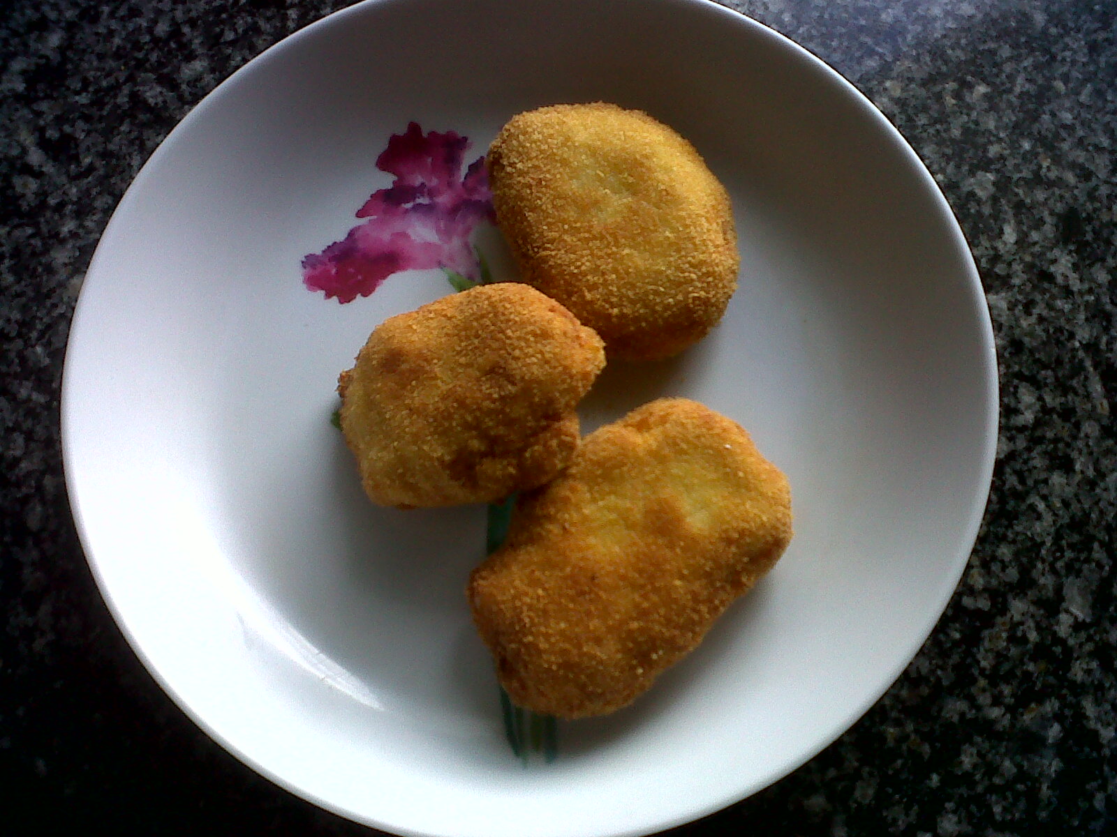 Haz bolas con la masa luego aplasta y pasa por harina, el huevo y el pan rayado.