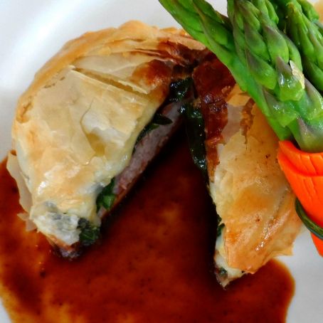 Hojaldre de solomillo ibérico con foie y salsa de frutos rojos