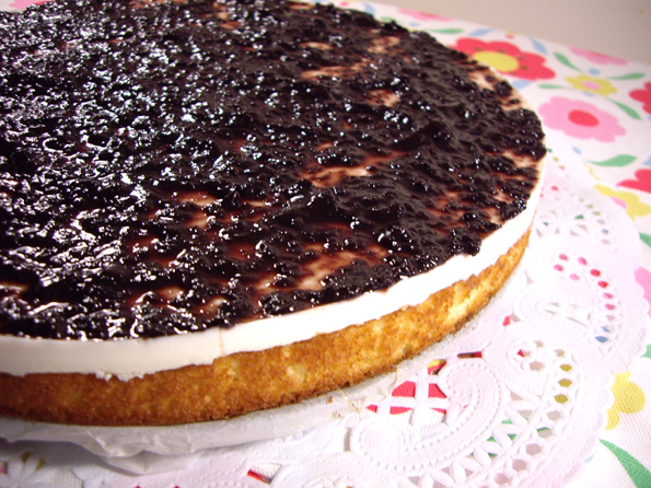 Una tarta casera de esas sencillas, tarta de cuajada con una mermelada de mora, frambuesa, cereza o fresa. Antes esta tarta la solía hacer con sobaos pasiegos, pero desde que aprendía a hacer esta base de bizcocho, la prefiero así.