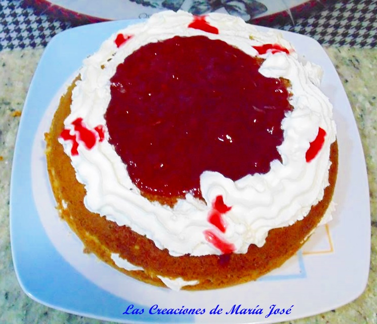 DECORACIÓN: Se abrió el bizcocho a la mitad y se relleno de nata. En la parte de arriba, en el centro se puso mermelada de fresa, alrededor nata y un poco de sirope de fresa encima de la nata.