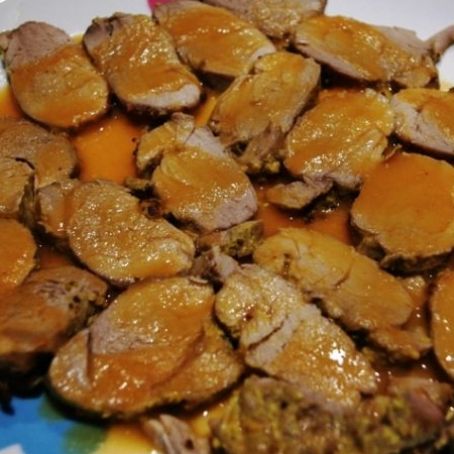Si el solomillo es muy largo, cortarlo por la mitad en dos trozos. Salpimentar la carne y untarla bien con una mezcla hecha con mostaza normal y de Dijon a partes iguales. Colocar la carne encima de las verduras. Regar con el vino blanco y cocinar en el horno durante 30 minutos. Transcurrido el tiempo, darle la vuelta a la carne, volver a untarla de la mezcla de mostaza, regar con el agua y cocinar otros 20 minutos en el horno.
