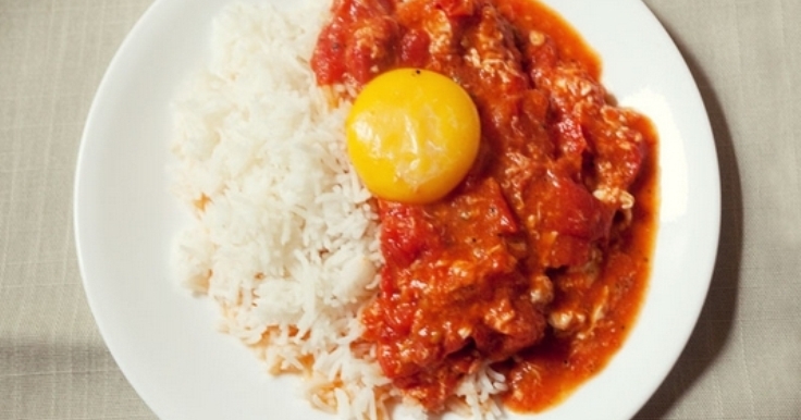 Una vez esté el arroz listo, se acompaña con salsa de tomate, salchichas y huevos fritos.