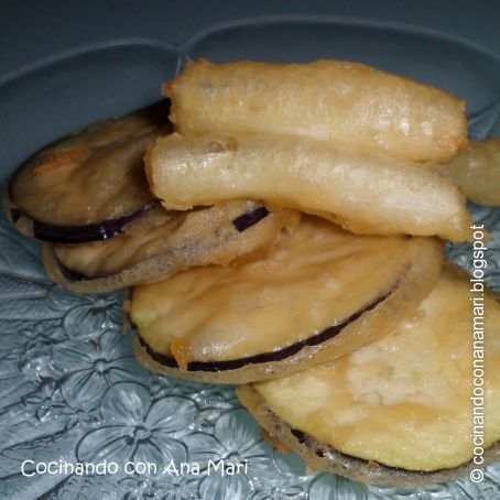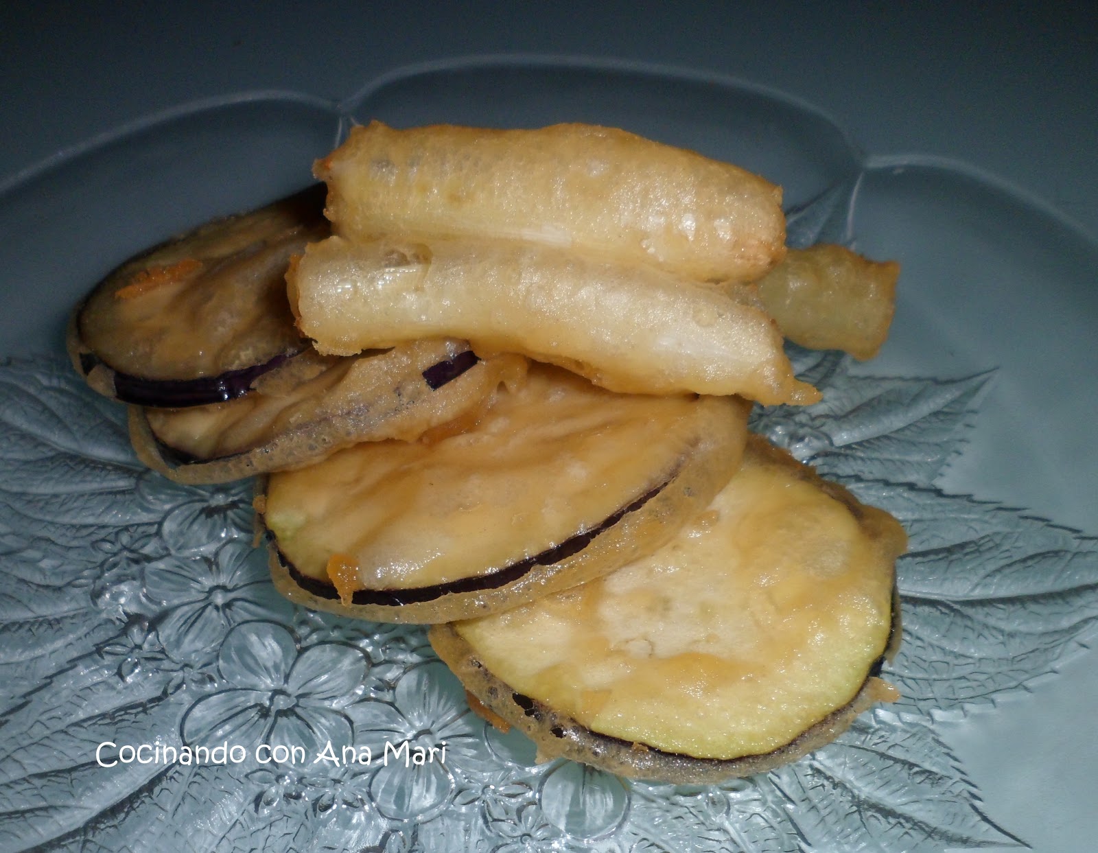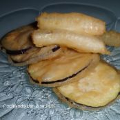 Cuando el aceite esta bastante caliente vamos bañando la berenjena y la cebolleta en la gacheta que hemos preparado y se pone a freír hasta que coja el color dorado que es cuando se debe de sacar, así sucesivamente hasta que lo tengamos todo.