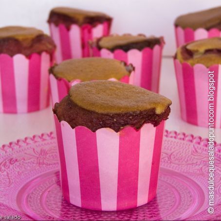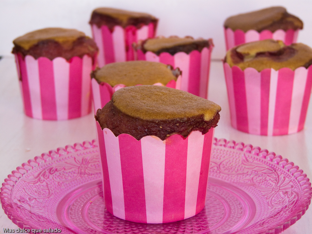 Prepara un molde para magdalenas o cupcakes con cápsulas de papel. Ponemos un poco de masa en el fondo, seguimos con una cucharada de mermelada y cubrimos con masa. Rellenaremos las cápsulas hasta las 3/4 partes de su capacidad.