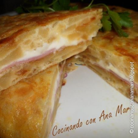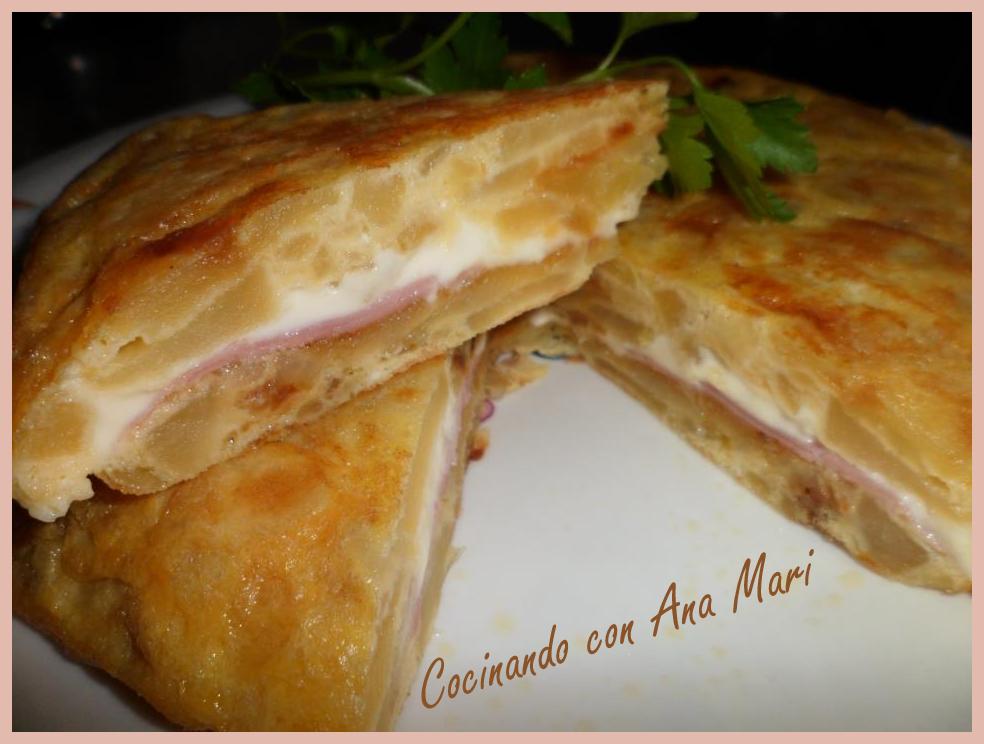 Cortamos la patata muy finita para que se dore bien y la volcamos con la cebolla, la freímos a fuego lento y mientras preparamos los huevos, lo mezclamos todo y una vez que la vallamos a poner en la sarten pondremos la mitad de la mezcla le ponemos el jamón york y el queso y le añadimos el resto de la mezcla, y ya la cuajaremos a fuego lento para que se haga bien.