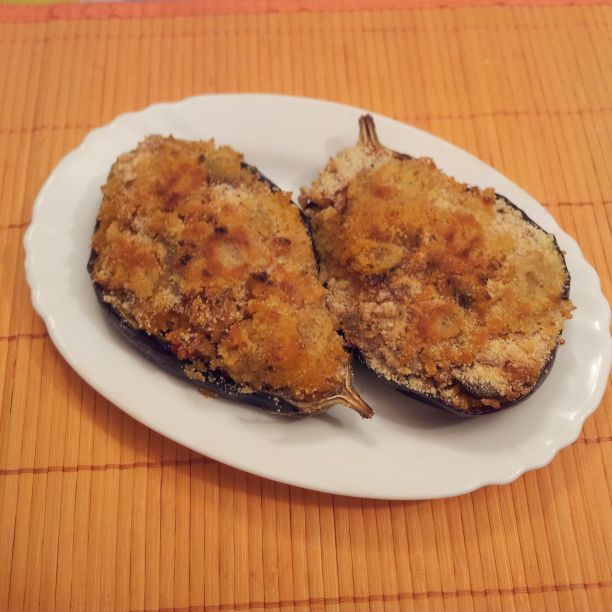 8° Rellenar las berenjenas y espolvorear pan rallado por encima.