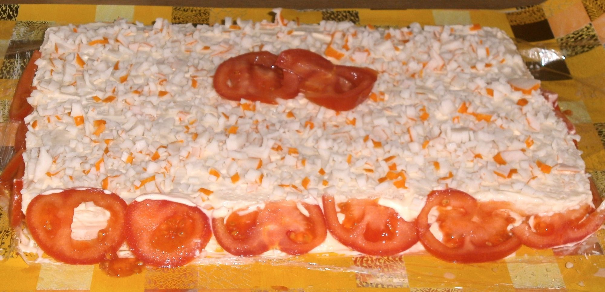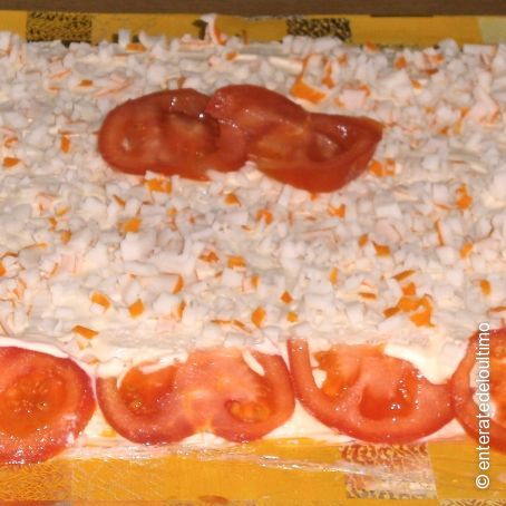 Decoramos por encima con el resto de barritas de surimi (6) bien picadas, y adornamos por los laterales con el tomate natural en rodajas.