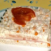 En un molde rectangular ponemos una base de 6 reba de pan de molde y lo untamos con la mezcla que acabamos de preparar. Encima colocamos el jamón cocido; encima del jamón ponemos el queso y untamos el queso con el tomate triturado. Por último, tapamos con otras 6 rebanadas de pan de molde.