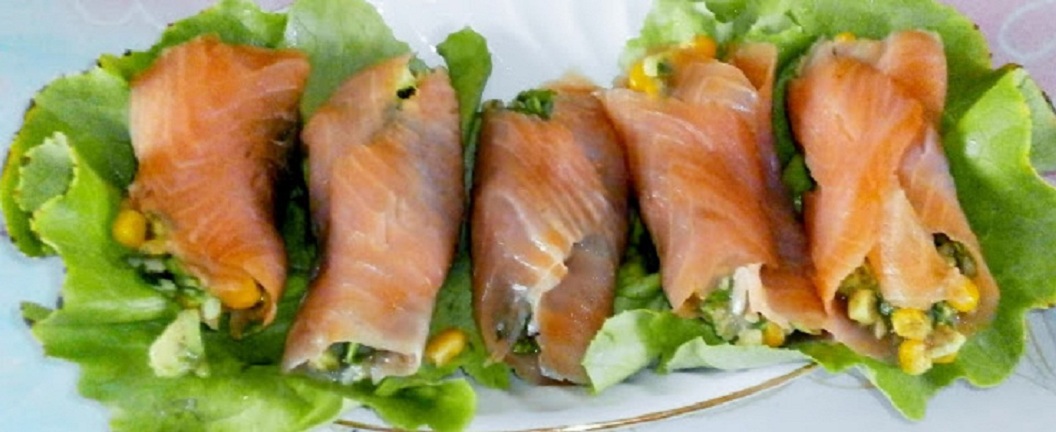 En un plato extendemos las lonchas del salmón ahumado y con una cucharilla ponemos parte de la mezcla en cada una de ellas y los enrollamos.