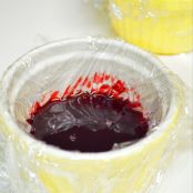 Forramos unos moldes pequeños con film transparente. Echamos la gelatina de mermelada. La dejamos enfriar en la nevera unos 20 minutos para que cuaje un poco y no se mezcle con el paté de queso.