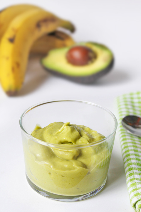Pelem el plàtan, ho tallem en trossos i ho posem en el got de la batedora juntament amb mig alvocat, que hem pelat i llevat l'os. Triturem bé i servim.