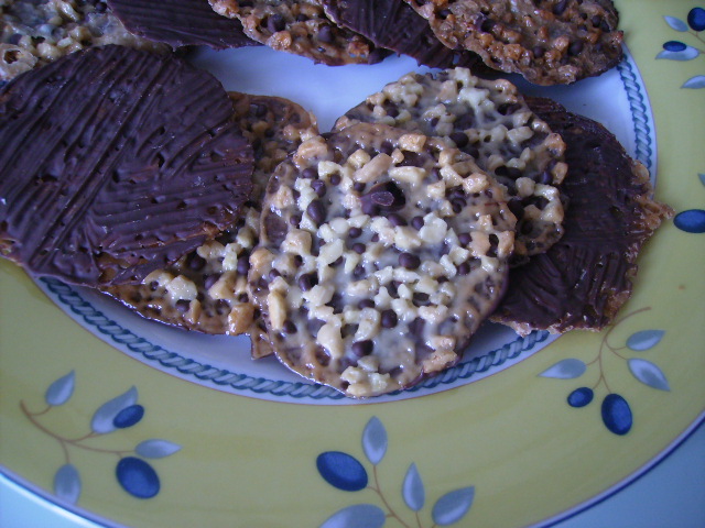 Galletas muy finas con frutos secos y una fina capa de chocolate.