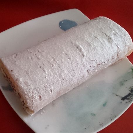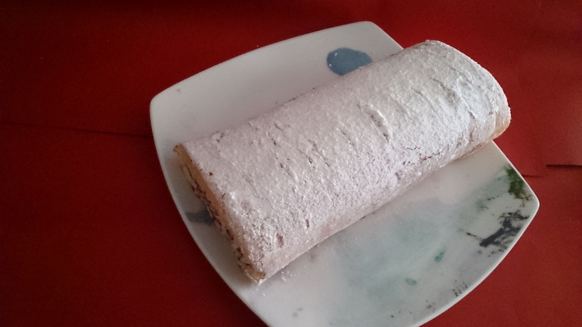 Bicocho untado con mermelada y enrollado sobre si mismo.