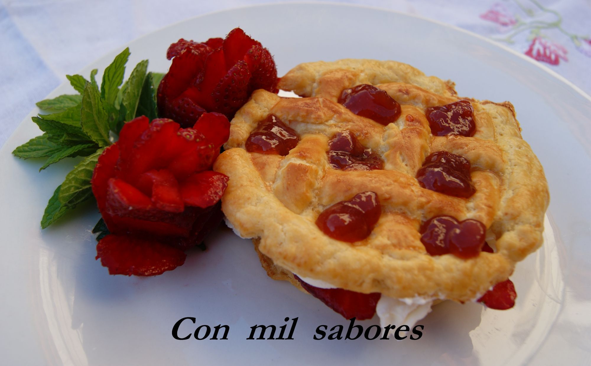 En primer lugar prepararemos la plancha de hojaldre. Para ello cortaremos unos círculos para las bases y las tapas que cubren el postre las haremos a modo de rejillas, como para empanadas. De esta forma la mermelada del relleno asomará por la superficie y la estética del plato será muy bonita.