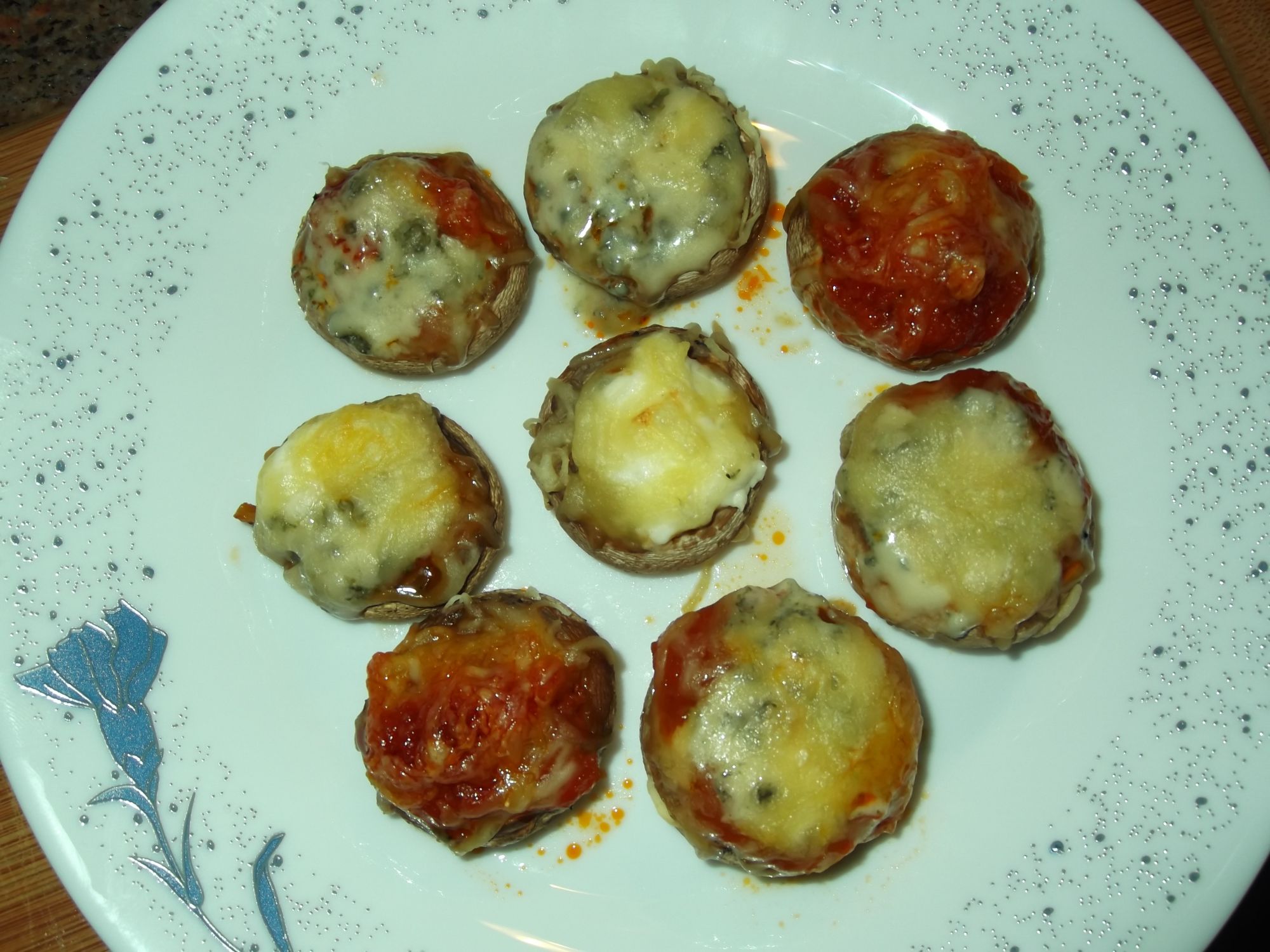Debéis limpiar muy bien los champiñones, les quitamos el pie y en el hueco colocamos un poco de tomate frito con orégano y unas gotas de aceite. Encima le colocáis los ingredientes que más os gusten, el queso azul le da un toque buenísimo, así como la sobrasada o cualquier embutido. Si los queréis hacer más sanos ponerle algo de verdura, atún o anchoas.