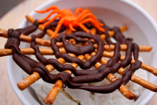 Poner dos cucharadas de chocolate negro fundido en una manga pastelera pequeña. Untar la mitad de las magdalenas con chocolate blanco. Con la manga dibujar cuatro círculos concéntricos de chocolate negro sobre cada glaseado blanco. Para la telaraña, agarrar un palillo y arrastrarlo cada cierta distancia, desde el centro hacia el borde, por encima de los círculos.