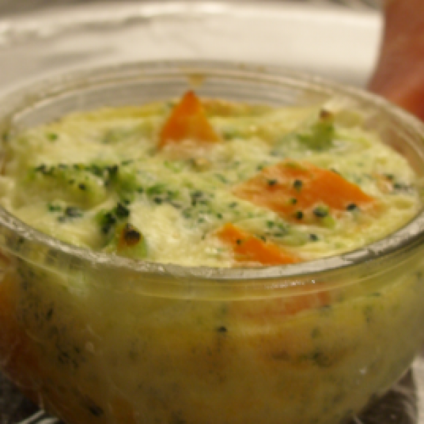 Mientras tanto, bate 4 huevos, agrega 4 cucharadas de nata y una pizca de sal y la albahaca. Revuelve hasta que quede suave. Añade a esta mezcla el queso de cabra, cortado en cubito y las verduras (corta el brócoli si es demasiado grande).