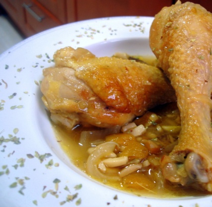 1. Doramos en una sartén, con un tres cucharadas de aceite de oliva, los muslos de pollo previamente salpimentados.